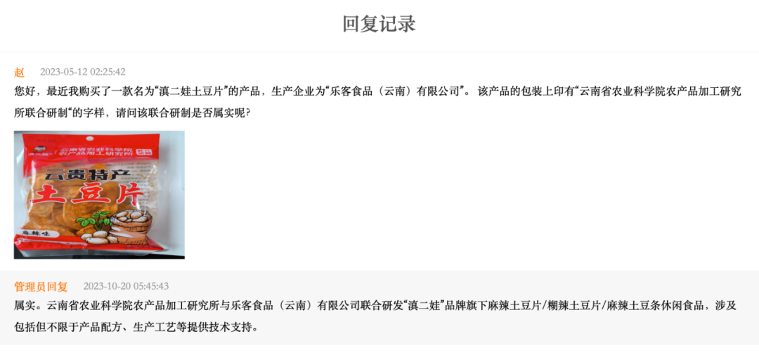 云南省农科院官网在5月12日曾回复“联合研制是否属实”相关提问称:属实。云南省农业科学院农产品加工研究所与乐客食品(云南)有限公司联合研发“滇二娃”品牌旗下麻辣土豆片/糊辣土豆片/麻辣土豆条休闲食品,涉及包括但不限于产品配方、生产工艺等提供技术支持。