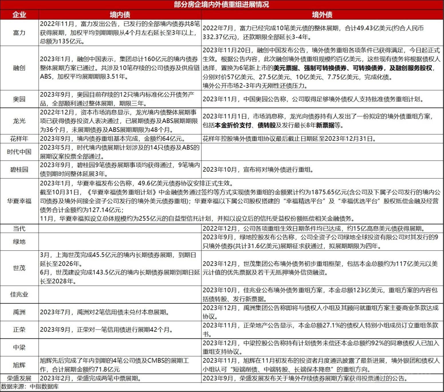 自恒大危机以来,已有50余家房企相继出险,开启了漫长的债务重组。2023年三季度开始,房企债务重组工作进展有所加快,特别是境外债重组,多家房企均披露境外债重组方案初步框架或取得部分债权人支持。