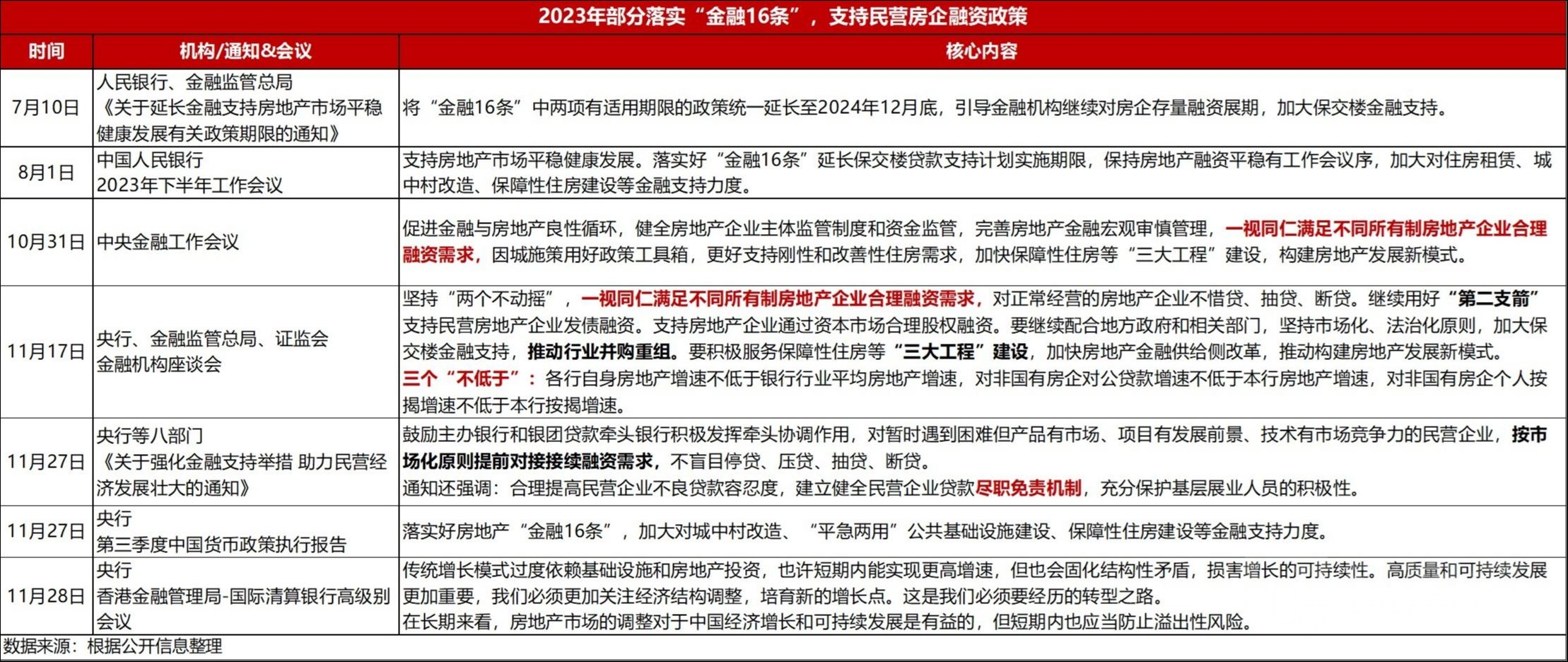 11月,央行、金融监管总局、中国证监会联合召开金融机构座谈会,贯彻落实中央金融工作会议的精神和部署,要求坚持“两个毫不动摇”,一视同仁满足不同所有制房地产企业合理融资需求,对正常经营的房地产企业不惜贷、抽贷、断贷;继续用好“第二支箭”支持民营房地产企业发债融资;支持房地产企业通过资本市场合理股权融资。
