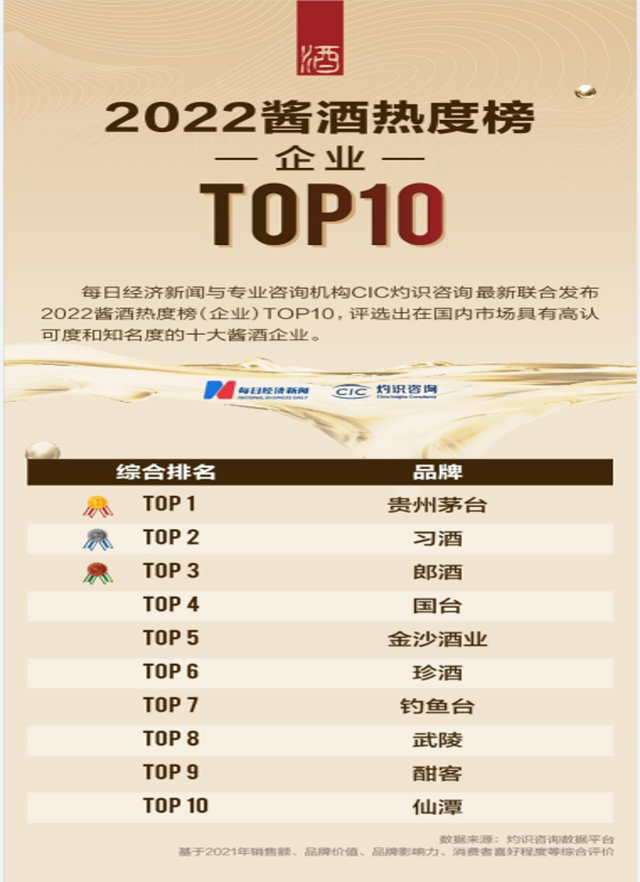 事实上,除了茅台之外,四川郎酒、贵州习酒、国台酒业、金沙酒业等级均是酱香白酒的有力竞争者。在灼识咨询发布的2022年酱酒热度榜TOP10中,珍酒仅排第六位。