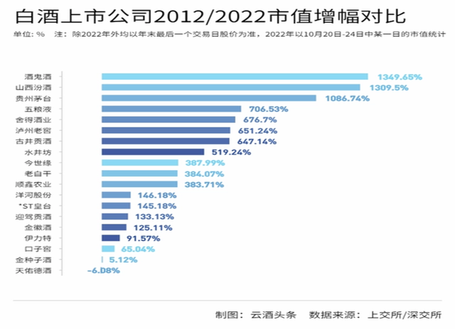 在国内上市公司中,白酒就是容易诞生“大鱼”的领域。一组公开统计显示:2012年至2021年十年间,A股总市值从23.04万亿元增长到91.61万亿元,增幅为297.61%,而白酒上市企业十年总市值增幅高达710.75%。