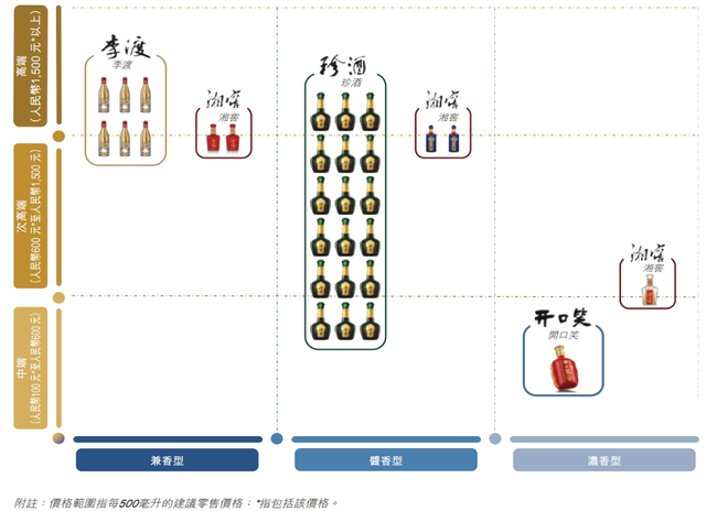 贡献第三、四的品牌为“湘窖”与“开口笑”,两个品牌在2020年-2022年三个完整财年对上市公司的收入贡献平均值在8.8%。其中湘窖主打次高端、涉及酱香、浓香、兼香白酒产品。开口笑主打大众产品,涉及酱香、浓香白酒产品,上述两大品牌均为湖南地方性品牌,产地与销售均集中在湖南本地。
