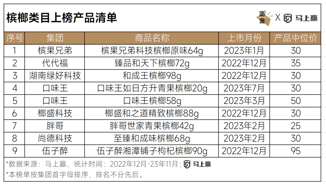 榜单中,口味王有两款新品上市,其他集团都只有一款创新产品,多为原味或青果槟榔;伍子醉则推出了枸杞槟榔,主打养身卖点。