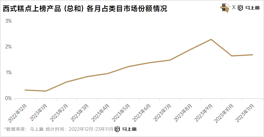 从上榜新品的月度市场份额来看,西式糕点类目中的上榜新品月均市场份额从5月开始就稳定在1.5%~2.5%左右。