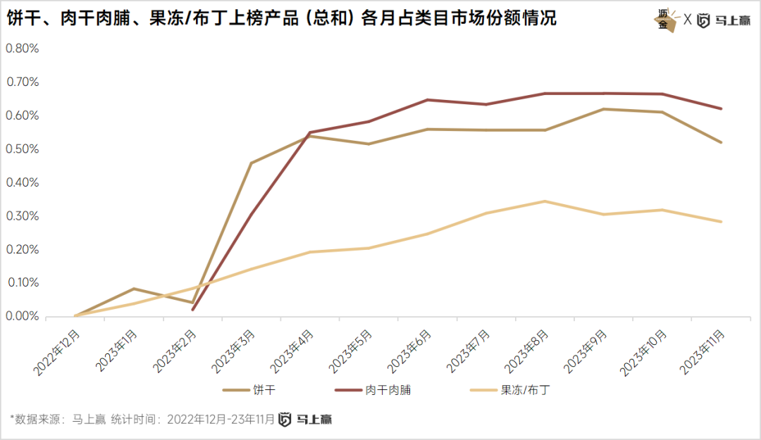 饼干、肉感肉脯、果冻/布丁上榜产品各月占类目市场份额情况