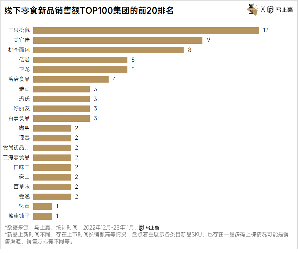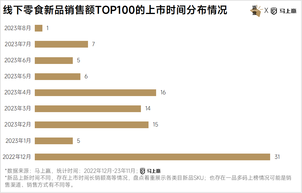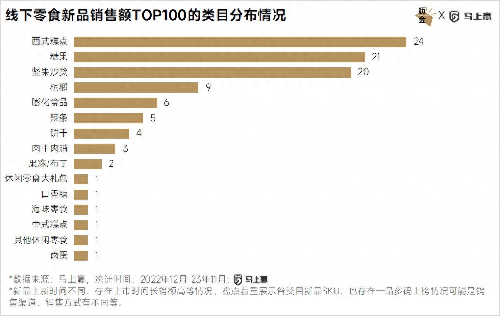 为回答上述问题,沥金首次联合马上赢对线下零食新品进行了深入研究和分析,对近一年内零食新品的SKU进行销售额降序排列,取前100个SKU进行了拆解,以下是结论总览: