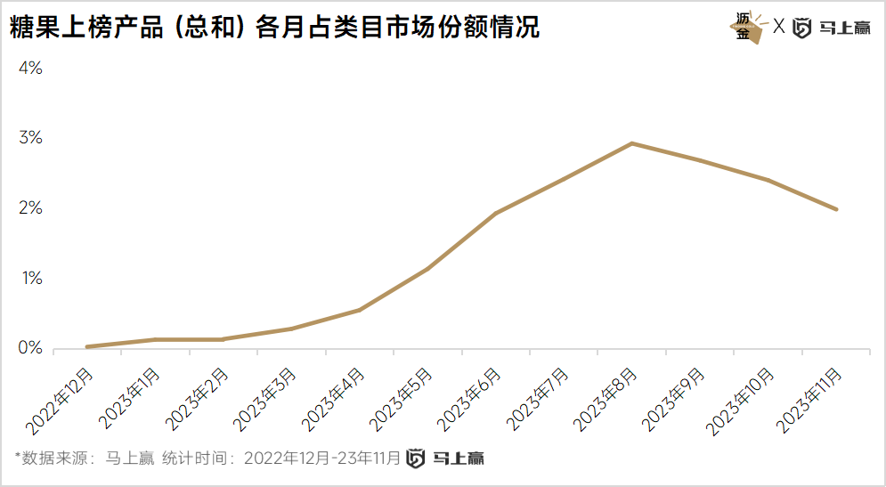 从上榜新品的月度市场份额来看,槟榔产品在2022年12月-23年2月集中上市后,上半年销售较差,类目整体创新性不大,但在6月后直线向好,一路攀升,11月达到峰值3.9%。
