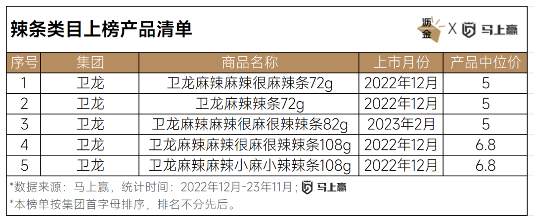 从榜单可见,卫龙一家独大,近一年上新5款新品,推出的新品主要在克数、形状上有所不同。