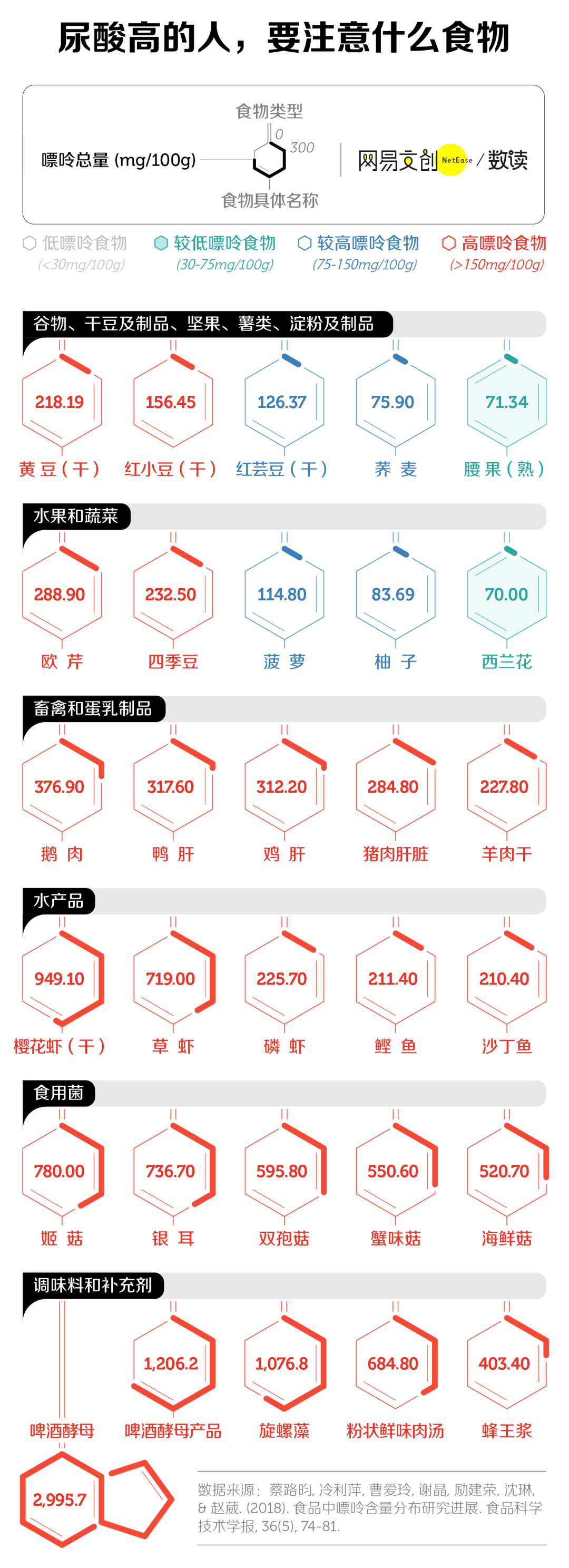 当然,还有一些不太为人熟知的“尿酸刺客”,例如黄豆、菌菇这些眉清目秀的益智强身食品,嘌呤含量也有大几百毫克 [10]。