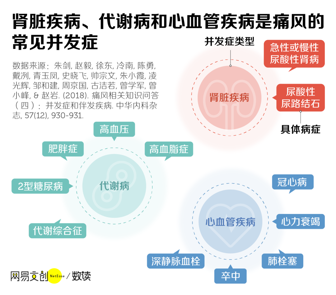 尤其是心血管疾病,和痛风的共患率达到 74%-91% [18],美国一项流行病学调查结果显示,痛风患者中 74% 有高血压,14% 有合并心肌梗死 [19],而且痛风发作后 120 天内,心血管事件会更容易发生 [20]。
