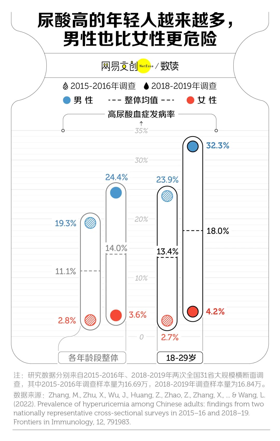 18-29 岁年轻人的高尿酸血症患病率,更是从 13.4% 上升至 18%,涨幅达 34%。