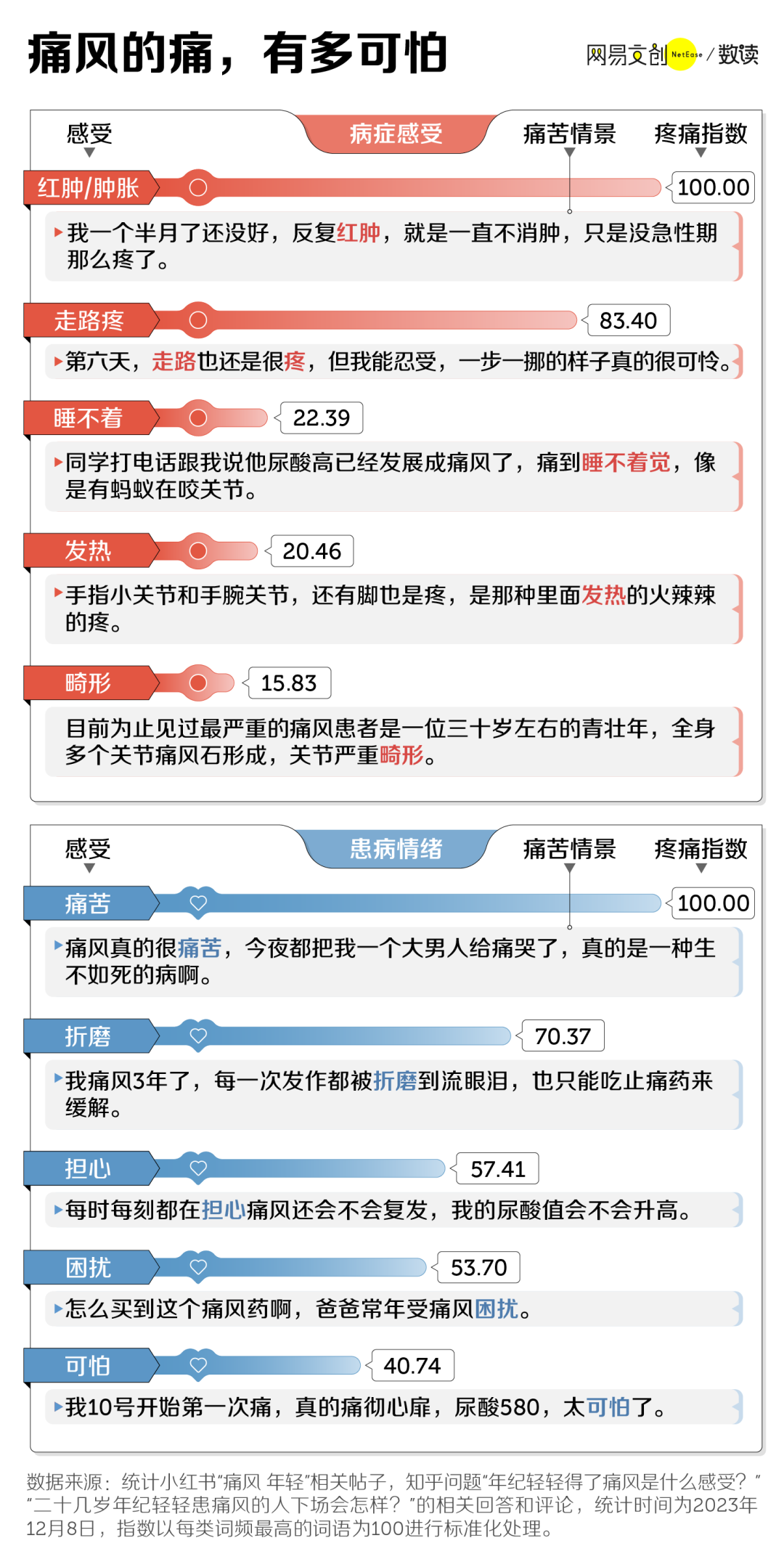 我们分析了知乎和小红书上痛风患者的经历,大部分人都会从大脚趾的关节开始,平时毫无存在感的部位突然发难,这种痛苦可能一路向上蔓延到脚踝、膝盖。病情较重时,肘部、手腕也在劫难逃,手指也像被容嬷嬷拿针扎过。