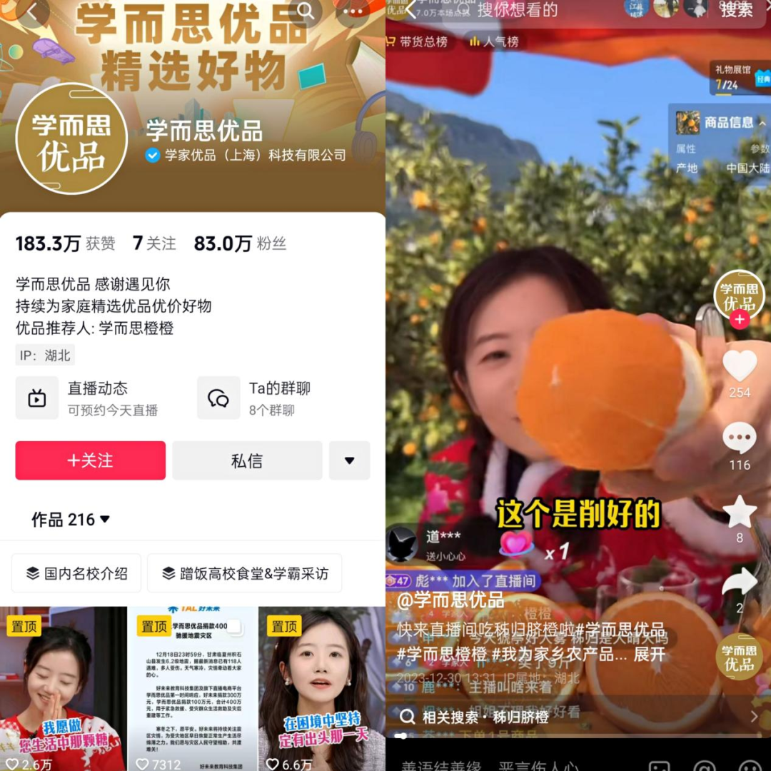以学而思为例,2022年11月,好未来学而思也开启了直播带货,同样主打农产品+全品类的方向,在东方甄选的风波事件后,账号@学而思优品 至今收获80多万粉丝,根据公开数据显示,12月11日-18日,@学而思优品 的直播间销售额达到250-500万元。