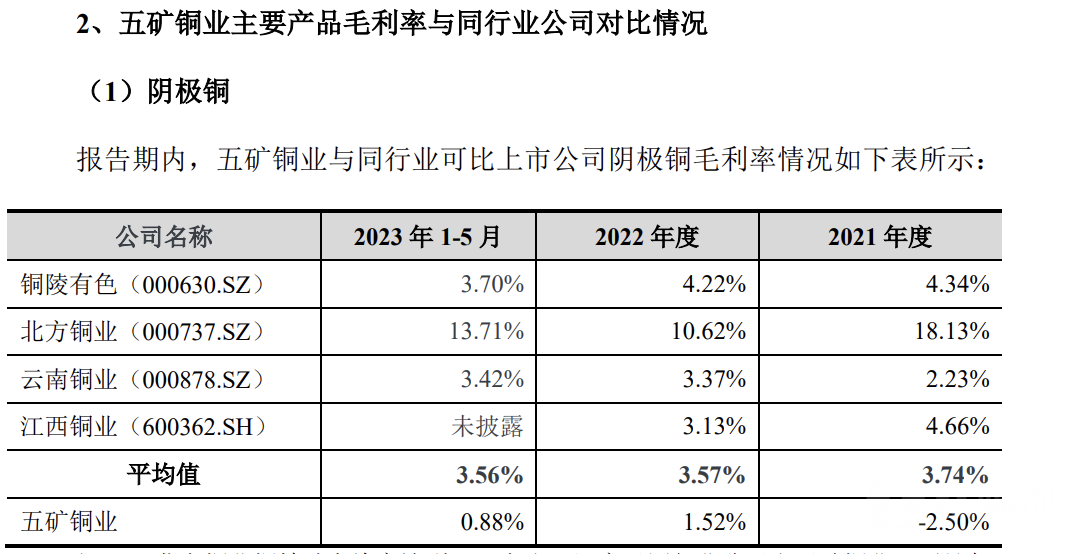 2021年至2023年1-5月,五矿铜业主营业务毛利率分别为2.59%、5.36%、4.42%,其中收入占比超八成的阴极铜业务销售毛利率分别仅为-2.5%、1.52%、0.88%,该业务的毛利率波动较大,曾在2021年出现亏本的情况。对比同行来看,相应报告期内,五矿铜业的阴极铜业务毛利率低于行业均值的3.74%、3.57%、3.56%。