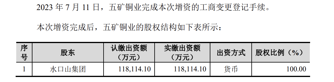 值得注意的是,在评估基准日前一日,水口山集团对五矿铜业突击增资。2023年5月30日,水口山集团以现金方式向五矿铜业增资9800万元。本次增资完成后,五矿铜业注册资本由10.83亿元增加至11.81亿元。