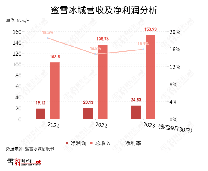 招股书显示,两家公司已经成为了国内规模排名第一、第二的茶饮品牌。截至2023年9月,蜜雪冰城拥有超过3.6万家店铺,GMV 370亿元,年收入154亿元。2023年前9个月,蜜雪冰城共计卖出59亿杯饮品——几乎相当于所有中国人9个月内每人买过4杯蜜雪冰城。