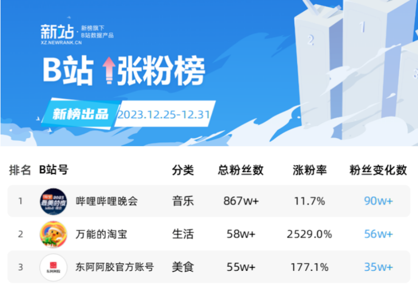 从2019年开始,最美的夜跨年晚会的精彩节目就时常被B站网友反复回看。截至发稿前,《2023最美的夜》视频合集播放量也已经达到1.4亿。而据新榜统计,2023年最后一周的B站涨粉榜中,前三名分别是哔哩哔哩晚会、万能的淘宝和东阿阿胶官方账号。可见优质跨晚内容给品牌带来的沉淀。