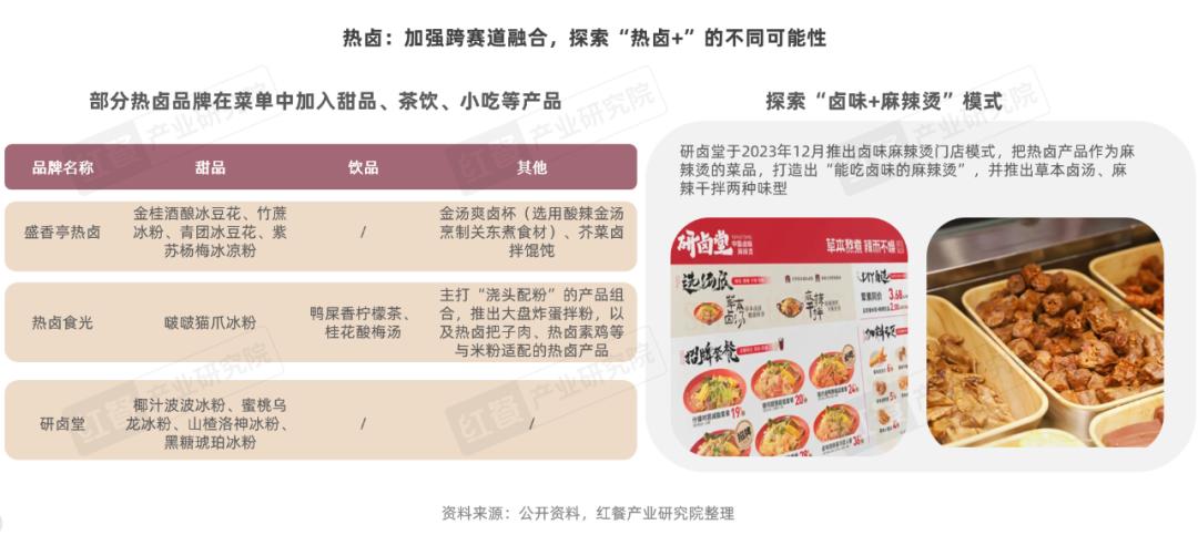 例如,研卤堂于2023年12月推出卤味麻辣烫门店模式,把热卤产品作为麻辣烫的菜品,打造出“能吃卤味的麻辣烫”,并推出草本卤汤、麻辣干拌两种味型。