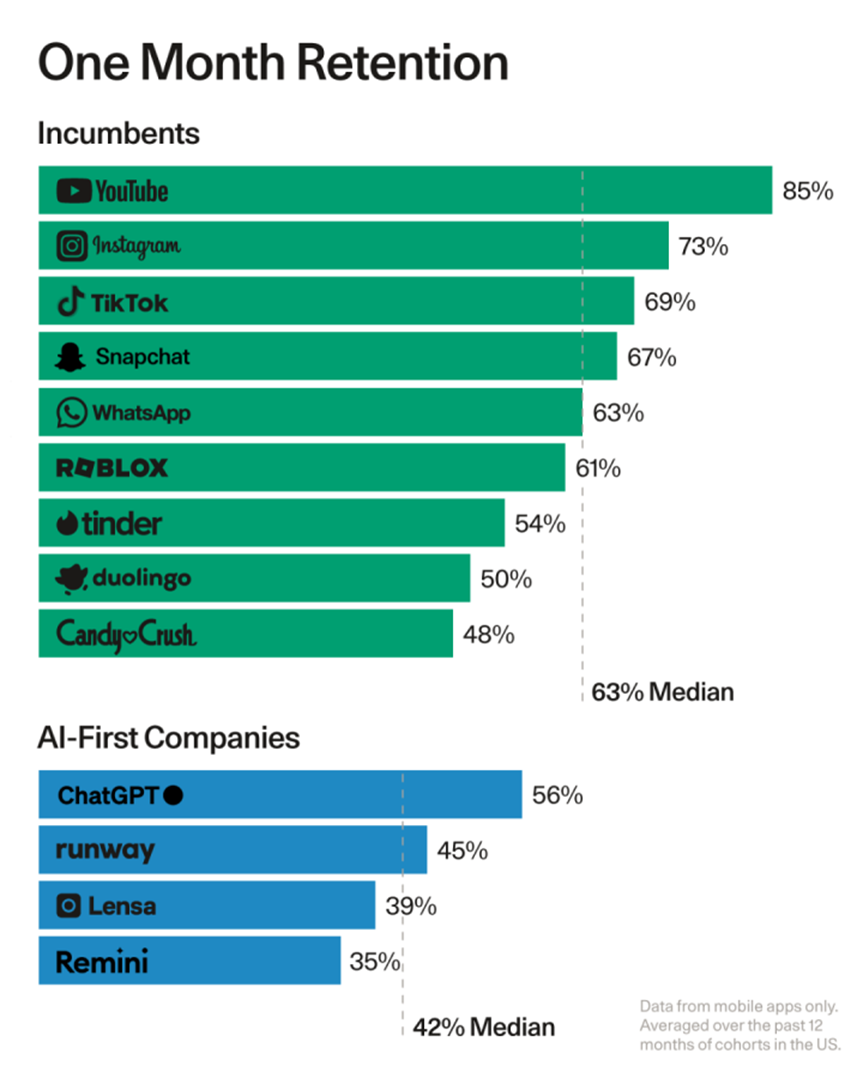 据红杉资本于《生成式AI第二幕》的数据,包括ChatGPT在内的AIGC应用,在用户的留存与活跃上可以说是完败于我们熟知的移动应用。以首月留存为例,即便是OpenAI都未能企及移动应用的中位数。