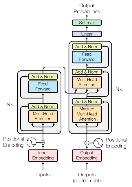 Transformer的模型架构图,左侧为Encoder,右侧为Decoder。图片来自谷歌论文