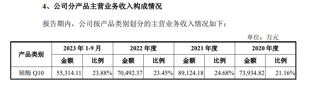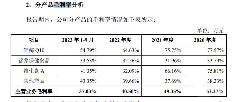 另外,该产品的毛利率也在持续下滑。2020年至2023年前三季度,辅酶Q10的毛利率分别为77.57%、75.75%、64.63%、54.79%,呈现四连降。
