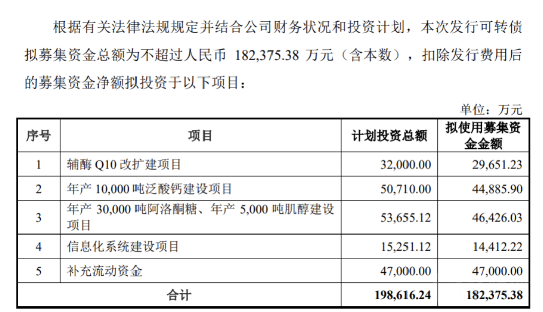 具体来看,“辅酶Q10改扩建项目”(下称项目一)拟扩产公司现有产品辅酶Q10,而“年产10000吨泛酸钙建设项目”(下称项目二)和“年产30000吨阿洛酮糖、年产5000吨肌醇建设项目”(下称项目三)主要产品泛酸钙、阿洛酮糖和肌醇属于公司拓展的新产品。
