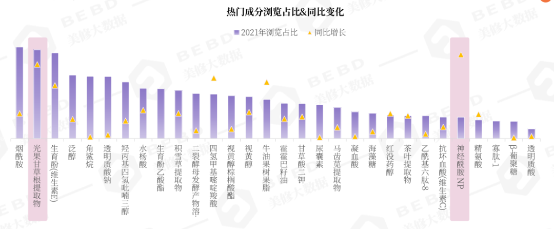 据美丽修行大数据发布的《2022年度功效成分洞察》报告,2021年热门成分的消费者关注度(浏览占比),光果甘草根提取物(即光甘草定)仅次于烟酰胺,位居第二位,关注度同比增长情况也是大大领先。
