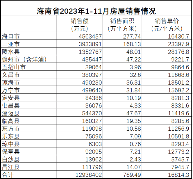根据海南省统计局公布的统计数据,2023年1-11月,海南省房屋销售面积769.49万平方米,销售额约为1293.84亿元,折合销售均价约16814.3元/平方米。