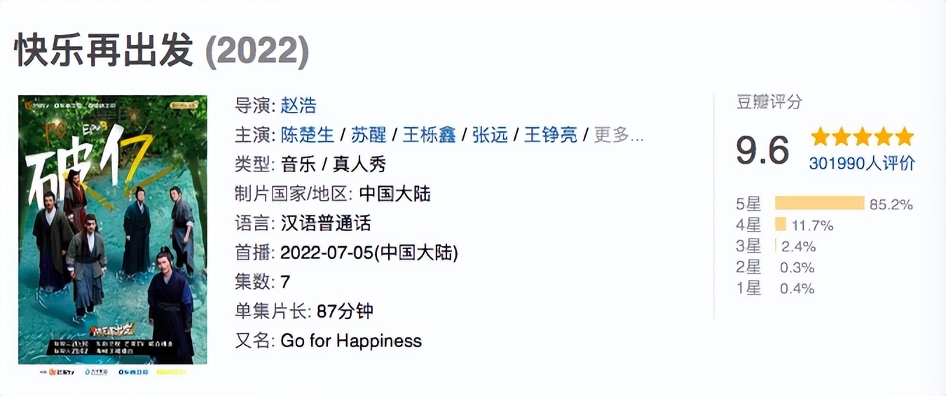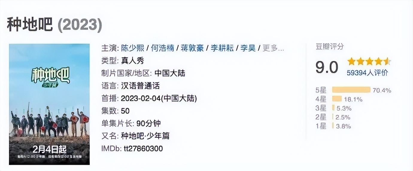 不过客观现实也需要正视:以市场认可度最高的爱奇艺《种地吧》为例,它豆瓣开分9.0、打分人数近六万,据媒体统计是今年打分人数最多的综艺。但事实的另一面却是:2022年被业内人士成为旗帜性作品的《快乐再出发》,豆瓣超30万人打出9.6分。换言之,距离真正的标杆性作品,还有较大的市场空间。