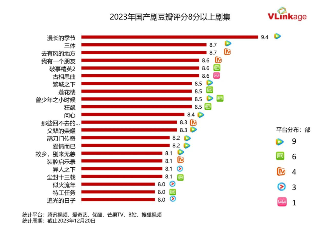 其一,腾讯剧集迎来爆发年和质变年。最显著的,在豆瓣23部超8分剧中腾讯视频占据9席,其中《漫长的季节》以93万人打出9.4分的成绩成为业内新标杆。在艺恩数据发布的年度报告中,腾讯视频的头部独播剧以数量和好评度均值双维度领先。