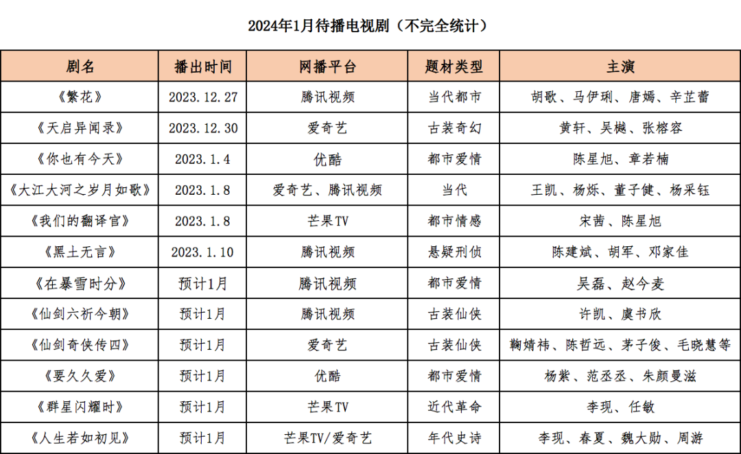 此外,近代革命题材《群星闪耀时》和年代史诗剧《人生若如初见》两部主旋律剧集也或将于1月上线。