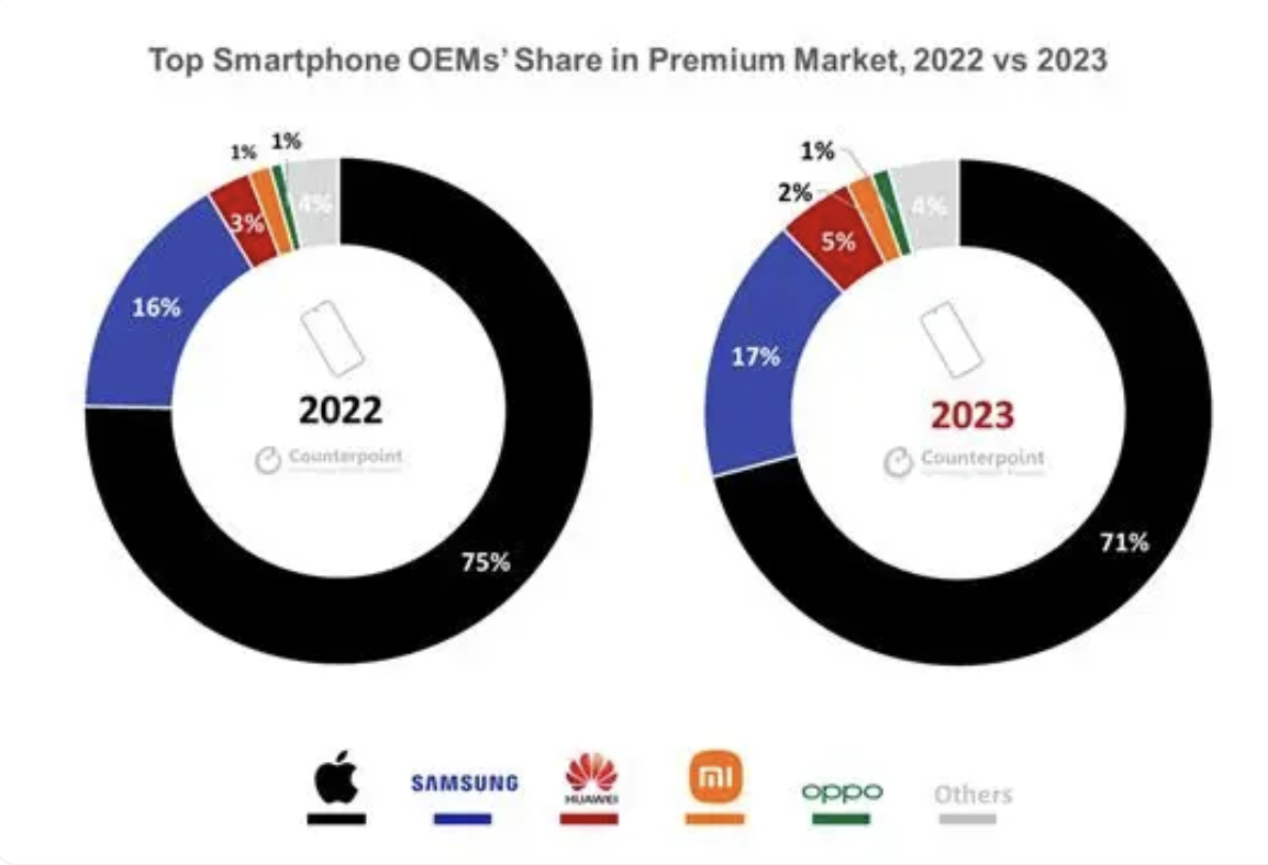 根据Counterpoint Research公布的数据显示,苹果的iPhone占2023年所有高端手机销量的71%,而在前一年,这一数字为75%。该公司的研究表明,这一变化主要是由于三星和华为的市场竞争加剧,这两家公司在2023年都增加了各自的市场份额。此外全球手机市场领域第一的「宝座」也被三星夺走,在国内市场的高端市场份额也逐渐被华为以及一众推出折叠屏手机的厂商所蚕食。