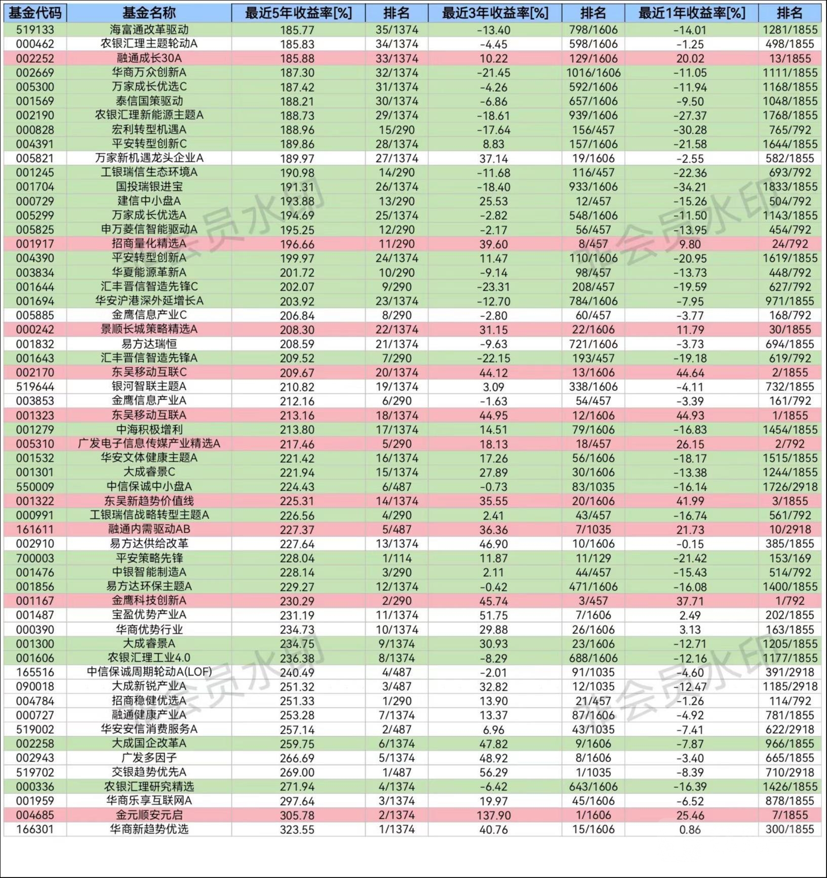 海通证券的这份研报揭露了一个长期以来可能为人所忽视的事实:即5年期业绩优异的公募基金有较大概率在最近1年中业绩扑街,其分位排名从同类头部下滑到中下游水平。如果我们选取最近5年收益率最高的前1%基金进行排名,可以得到一份57支基金构成的名单;其中5年期业绩最高的是华商新趋势优选(166301),收益率为323.55%;5年期收益率最低的是海富通改革驱动(519133),收益率也有185.77%。