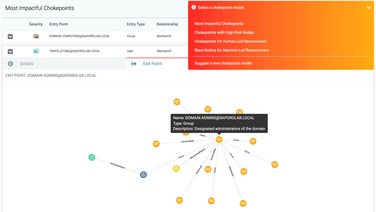 Saporo会主动对用户和系统访问风险进行压力测试,再利用图论和AI技术分析攻击路径、关键资产、用户访问和计算机配置之间的关联,来揭示所有内部身份攻击路径,包括跨本地与云端环境等混合环境中的隐藏路径。简单来说,Saporo能发现安全配置中的所有弱点,测量突破这些防御所需的努力,然后提供攻击者可能如何突破防御的信息。