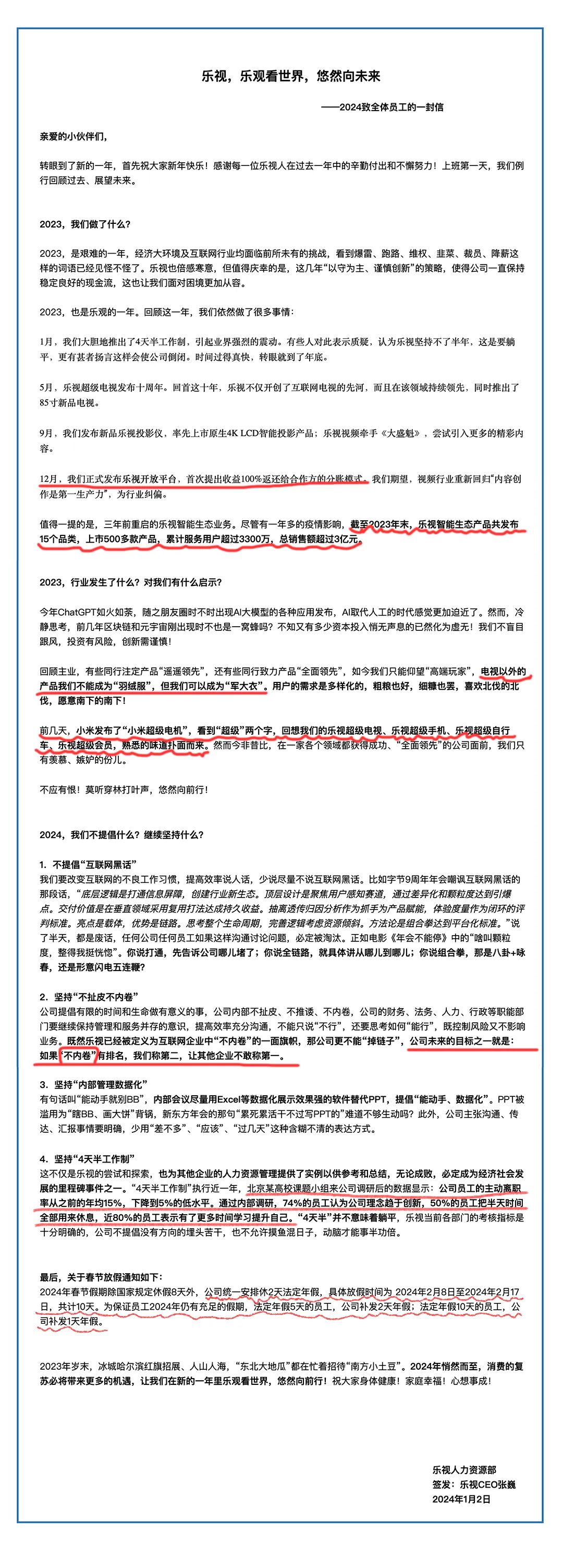去年元旦,乐视宣布施行每周4天半工作制,以“无内卷、无996的神仙公司”之姿,一时成为全网艳羡的对象。时隔一年,乐视再一次抢得新年头彩,在元旦后发布内部信宣布,春节提前两天放假(2月8日至2月17日,共10天)。