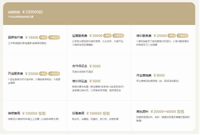 根据官网,古茗的加盟费用为9.88万元,可以分期支付,除此之外再加上保证金、开业营销费、装修、设备、原料等费用还需要准备5.8万元。如果加上运营成本,古茗给出的新店最低启动资金是23万元,这还不包括店面租金和转让费。