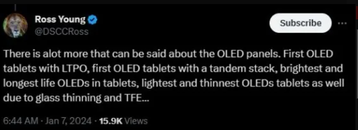 但它没有Mini-LED屏幕现有的泛光、绿屏问题,而且按照Ross Young的说法,这些即将上市的设备还将是首批采用串联堆叠技术的平板电脑,这项技术可以将iPad Pro OLED面板的耐用性提高四倍,同时将整体亮度提高两倍。