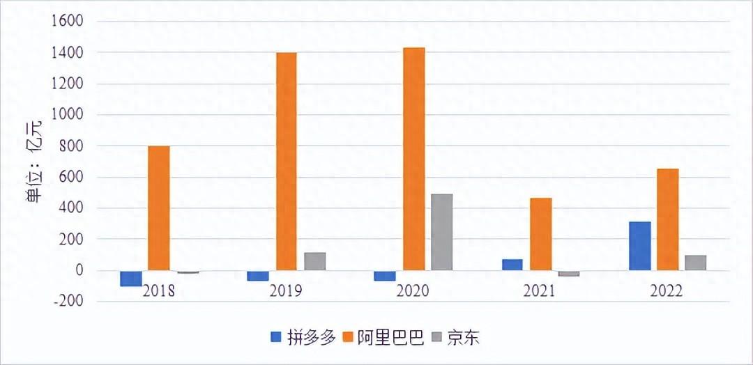 图1:2018-2022年拼多多、阿里巴巴&京东净利润对比图 资料来源:穆胜咨询整理,拼多多、阿里巴巴&京东财报