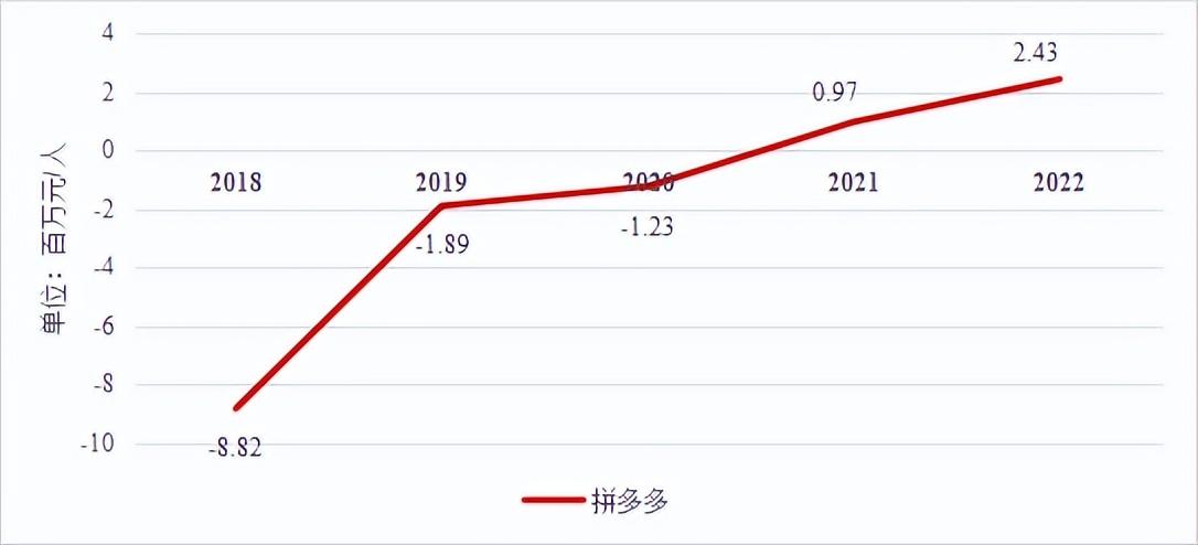 图2:2018-2022年拼多多、阿里巴巴&京东人均净利对比图 资料来源:穆胜咨询整理,拼多多、阿里巴巴&京东财报