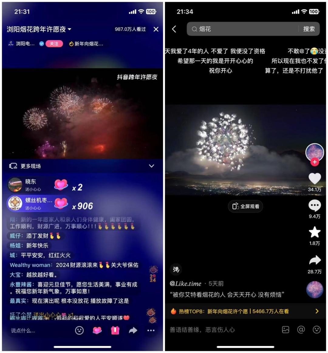 对于无法线下燃放烟花、观看烟花展的年轻人来说,“云烟花”也成了他们的最爱。今年跨年之夜,浏阳电视台在抖音举办了一场名为“浏阳烟花跨年许愿夜”的专场直播。数据显示,该场直播观看人数高达2357.5万人。