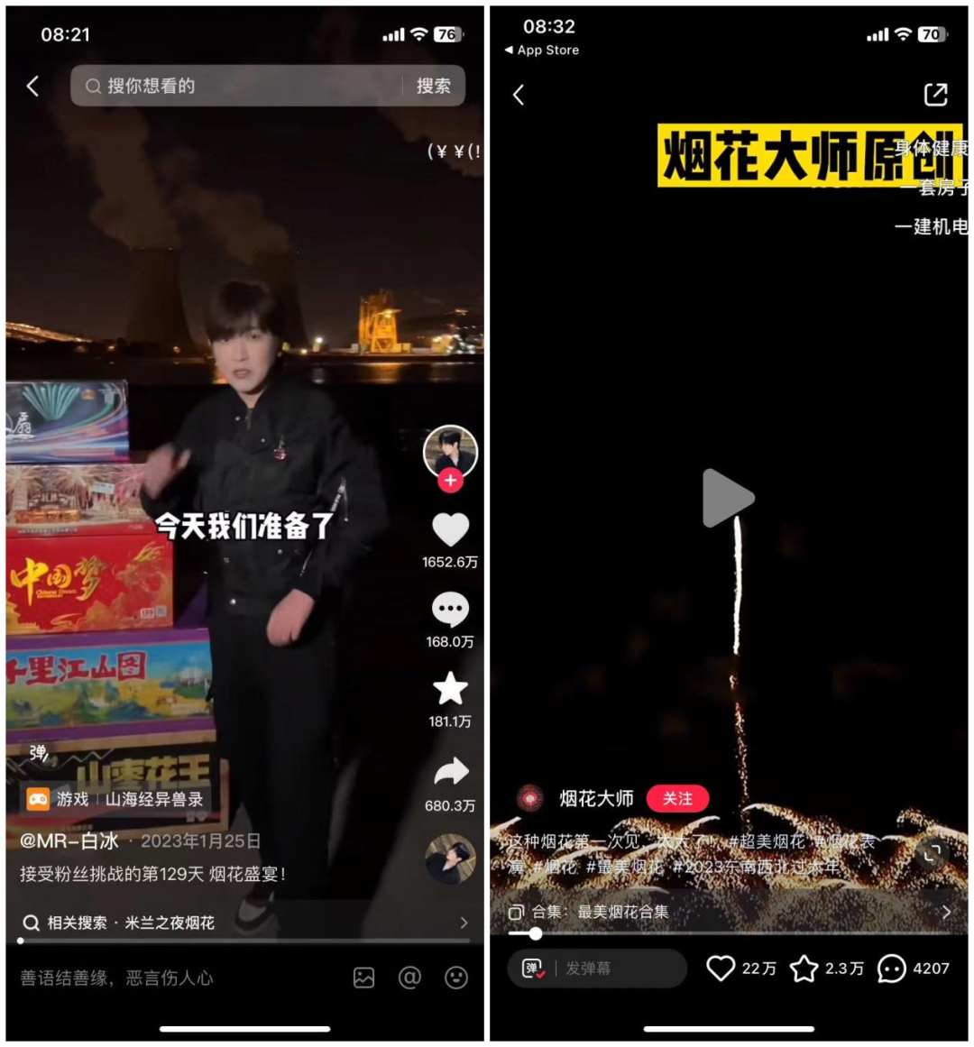 年轻人对烟花的追捧,一方面让烟花成为社交平台“流量密码”。在抖音上、小红书上,关于烟花相关视频的点赞量、评论量、转发量相当可观。如抖音博主@MR-白冰一条关于烟花的视频,点赞量、转发量分别高达1652万、680万。