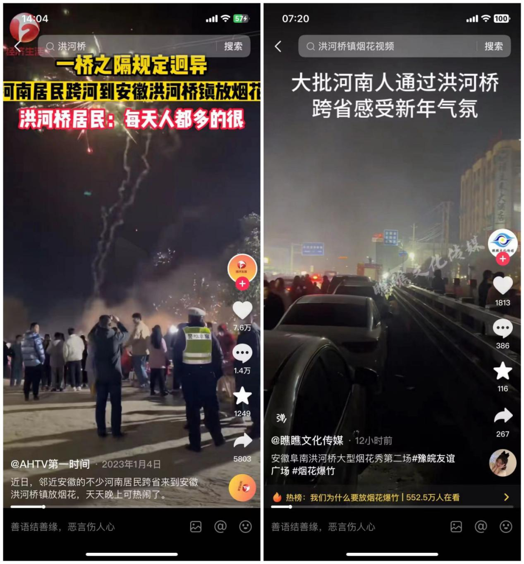 孙伟所提到的洪河桥位于安徽省阜南县和河南省淮滨县交界处的洪河桥镇,因当地允许燃放烟花爆竹,原本仅是一个农村贸易小镇,这两年却变成“网红打卡地”。