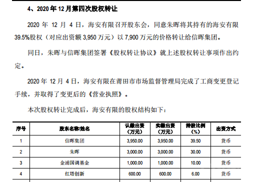 2020年7月,朱晖以10元/出资额的价格将其持有海安橡胶的部分股权分别转让给了红塔创新、红创合志;同月,朱晖以8元/出资额将其持有海安橡胶的部分股权分别转让给了员工持股平台明道投资、明河投资、明汇投资,合计转让价格为12840万元。