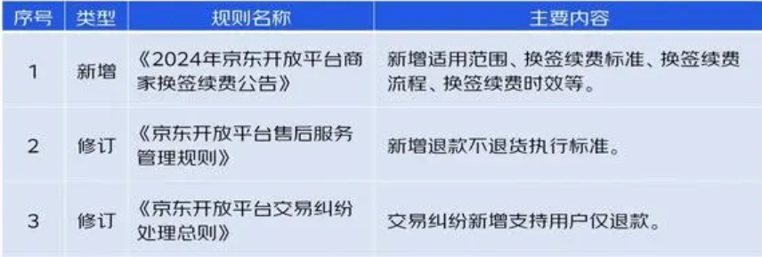 12月27日,京东通过服务号发布了每周规则动态,其中包括修订后的《京东开放平台售后服务管理规则》和《京东开放平台交易纠纷处理总则》,前者新增“退款不退货执行标准”,后者新增“交易纠纷支持用户仅退款”。两份原文件表明,分别于12月29日和12月27日生效。