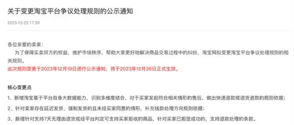 12月25日,淘宝官方渠道发布《关于变更淘宝平台争议处理规则的公示通知》,表明规则变更于12月19日进行公示通知,12月26日正式生效。此次规则主要变化在于平台将基于大数据能力,在卖家端和买家端多维度地判断某一商品是否存在描述不当、混淆误导、伪劣等情形,并对买家发起的符合相关情形的售后诉求直接做出“快速退货退款”或“退款”支持。