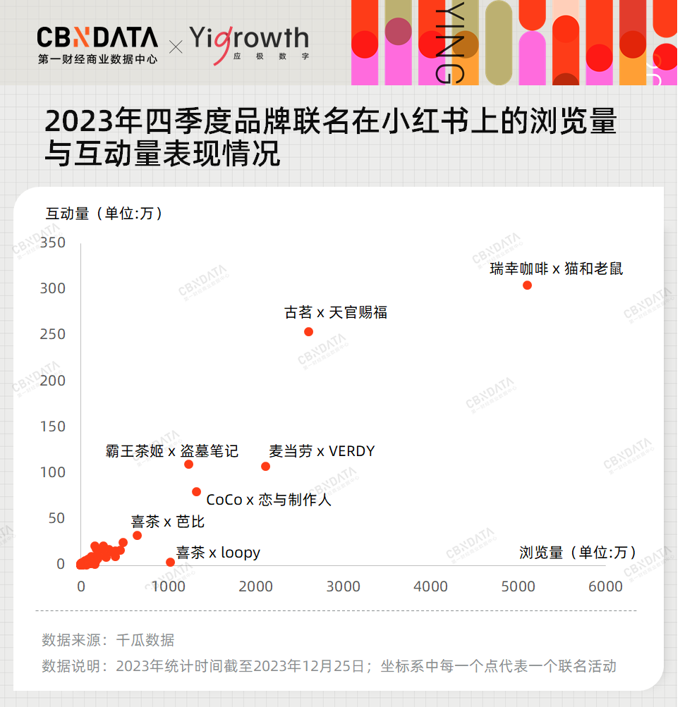 此外,联名出圈具有一定偶然性,需要“天时地利人和”,品牌无法确定每次联名都能精准踩到爆点,即使再充分的准备,一旦遇到更具势能的联名活动,随着对方滚起“雪球”,也难免落得一个“别人吃肉我喝汤”的尴尬境地。以2023年第四季度上线的250多个联名活动为例,小红书上总阅读量TOP30的联名就占据当期80%阅读量和85%互动量,其中茶饮品牌的联名优势尤为明显,当期30%阅读量和40%互动量被瑞幸x《猫和老鼠》以及古茗x《天官赐福》所吸引。