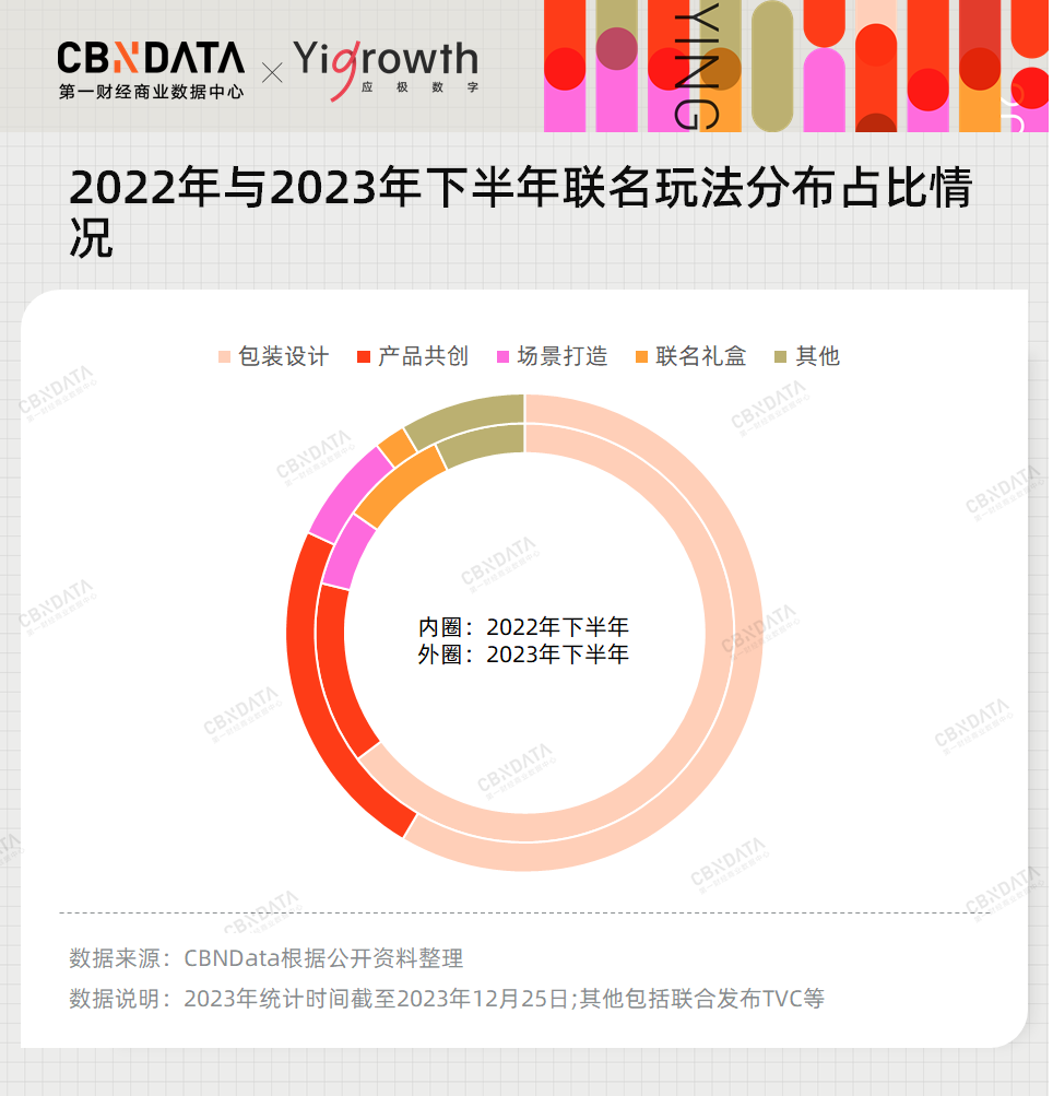 在联名玩法方面,品牌们也卷出了新高度。依靠生硬的logo加logo或是简单更换包装设计、制作礼盒的这类简单组CP方式,已很难在市场上激起太大的水花。近两年,产品共创、场景打造等深度合作成为品牌联名日渐热门的流量抓手,和2022年下半年相比,二者在2023年下半年的占比明显增加。
