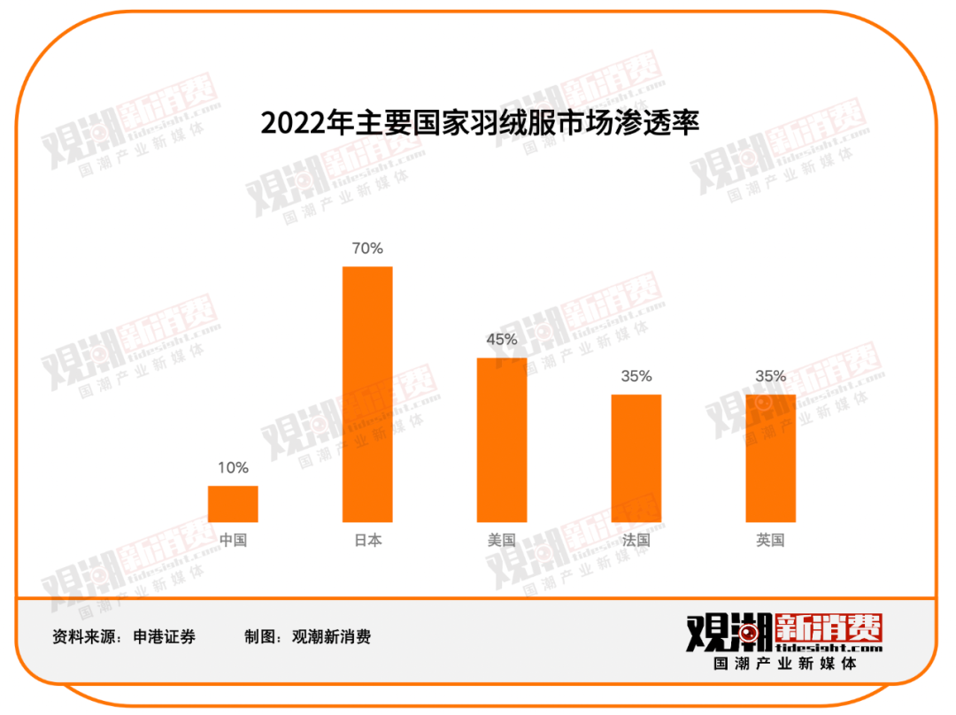 根据申港证券数据,截止2022年,中国羽绒服的普及率仅有10%,相比于欧美国家30%以上、日本70%左右的渗透率仍有较大提升空间。未来随着我国居民收入的提高以及消费升级,羽绒服市场空间将不断向上突破。据证券之星估算,如果按20%的渗透率计算,未来我国羽绒服市场规模或将超过3200亿元。