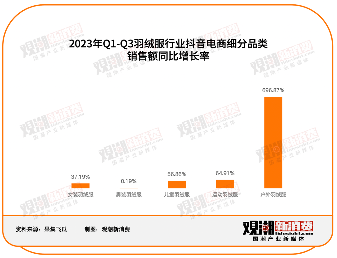 与此同时,场景本身也在推动羽绒服行业持续创新。根据果集飞瓜数据,伴随滑雪、露营等户外运动的火热,2023年前三季度国内户外羽绒服品类抖音电商的销售额较同期上涨696.87%,远超其他传统品类。