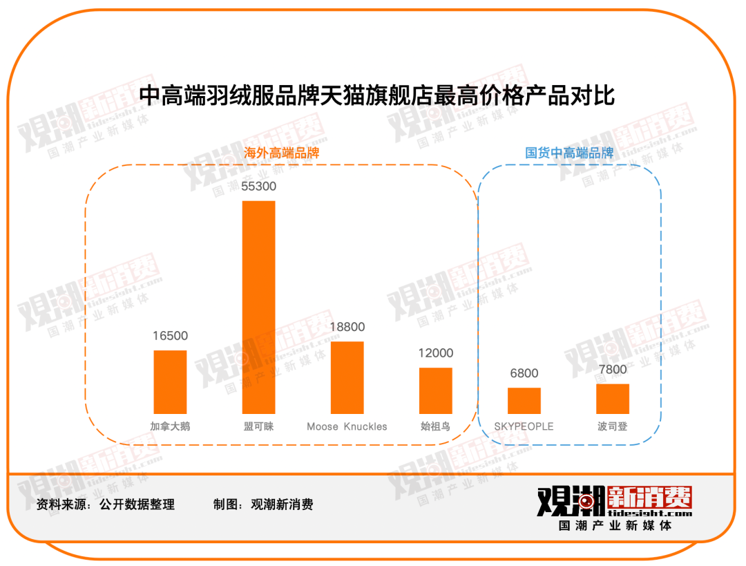 高端品牌主要以海外品牌为主。在加拿大鹅、盟可睐、Moose Knuckles、始祖鸟四大品牌的天猫旗舰店中,售价最高的羽绒服产品均在万元以上,其中盟可睐最贵的羽绒服产品更是高达55300元。